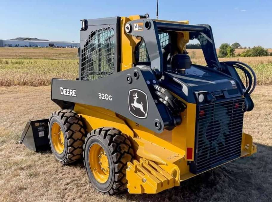 Used 2023 John Deere 320G Skid Steer Loader with high-flow hydraulics, 2-speed hydrostatic transmission, electrohydraulic (EH) ISO-pattern joystick controls and ride control. Deluxe instrumentation EMU with: Operator-selectable monitoring - Hour meter, engine rpm, battery voltage, diagnostics, EMU configuration, engine coolant temperature, hydraulic oil temperature / LED warning indicators - Glow plug, seat switch, seat belt, door open, auxiliary hydraulics, park brake engaged, 2-speed engaged, stop, low engine oil pressure, engine coolant over-temperature, battery not charging, air filter restriction, and hydraulic filter restriction.