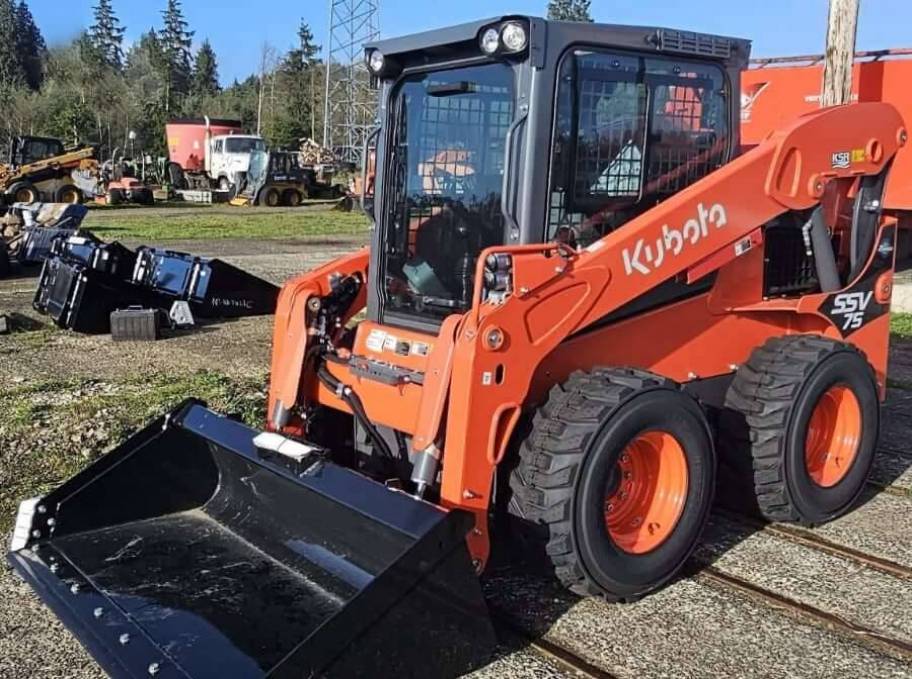 New 2026 Kubota SSV75 Skid Steer Loader. The OSHA-certified ROPS/FOPS cabin provides protection in the event of accidental rollovers or falling objects. The front sections of both side windows slide open towards the back of the cab. The side-window grilles are installed on the inside to let you easily clean the outer glass surfaces of the windows.