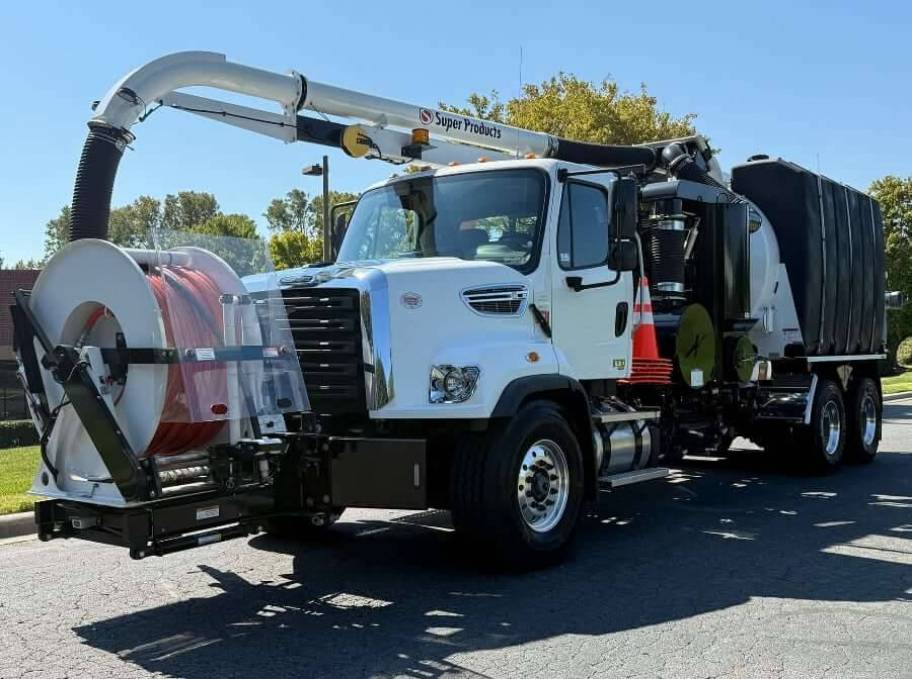 Used 2024 Super Products Camel 1200 Eject Unloading Combo Sewer Cleaner on 6x4 Freightliner 108SD Plus. The 1200 Eject model utilizes an eject unloading system. This allows operators to have the only controlled way to dump safely into a 48-inch container without the need of additional containment products. Optional features offer increased performance capabilities. A hydro excavation package allows operators to jet, vacuum and excavate continuously all day long, while an optional pusher axle allows for increased legal payload.