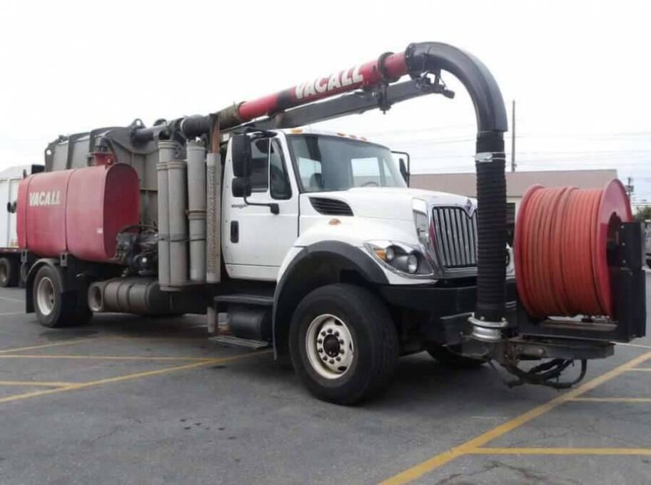 Used 2013 Vacall AllJetVac AJV 610 P Combination Sewer Cleaner on International WorkStar 7500 4x2 Truck. Remote Mounted Hydraulic Implement Controls - debris tank raise and lower, tailgate open and close. High-quality fully welded aluminum, 0.25" shell, 0.375" end plates, internal baffles, 2" ball valve for draining on each water tank.