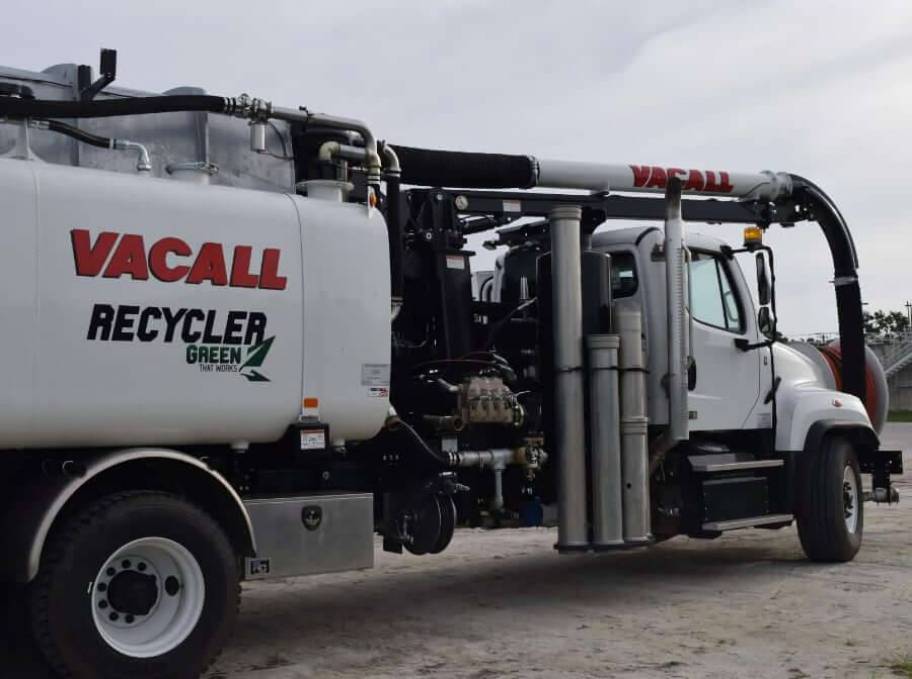 Used 2025 Vacall AllJetVac Recycler P Series on Freightliner 114SD Truck. Single control and cylinder to open, close and lock the tailgate. Floating V-Filtration screen, with back-flush self cleaning capability, filters the water. Debris and waste water undergo an initial sediment separation.