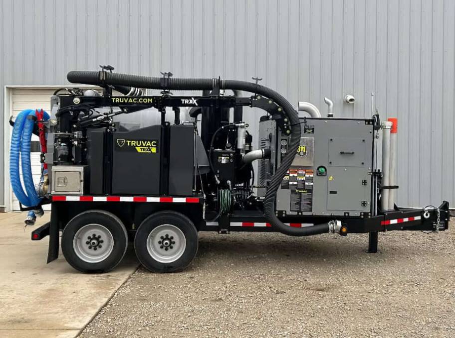 New 2026 Truvac TRXX 500 Trailer Vacuum Excavator. Standard: water pump 5 gpm @ 3000 psi; PD blower up to 1000 cfm; hydraulic rear door open/close and dumping; 3/8 in x 50 ft curbside water hose reel; digging lance & nozzle package (1 rotator nozzle & 1 straight tip single jet nozzle); strobe package & toolbox; 4 way valve with wireless remote operation for unclog feature; powered extendable boom with 4 in boom hose; boom work lights; powered tongue jack for trailer.