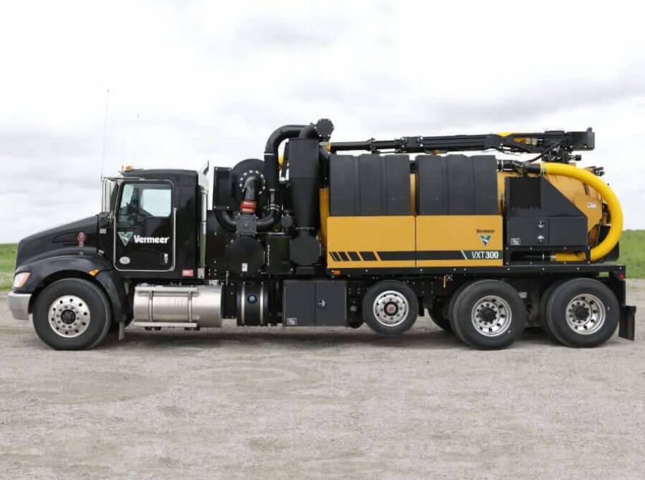 New 2026 Vermeer VXT300 Vacuum Excavator on Kenworth T480 8x4 Truck. Low overall height of 11.5 ft (3.51 m). Drive under a 12-ft (3.66-m) shop door or bridge with comfort. Plus, one of the lightest 8-yd3 (6.1-m3 ) trucks in the industry to maximize payload. A side PTO drive system allows the vac to keep running while moving the truck between holes, rather than requiring full machine shutdown for each move.
