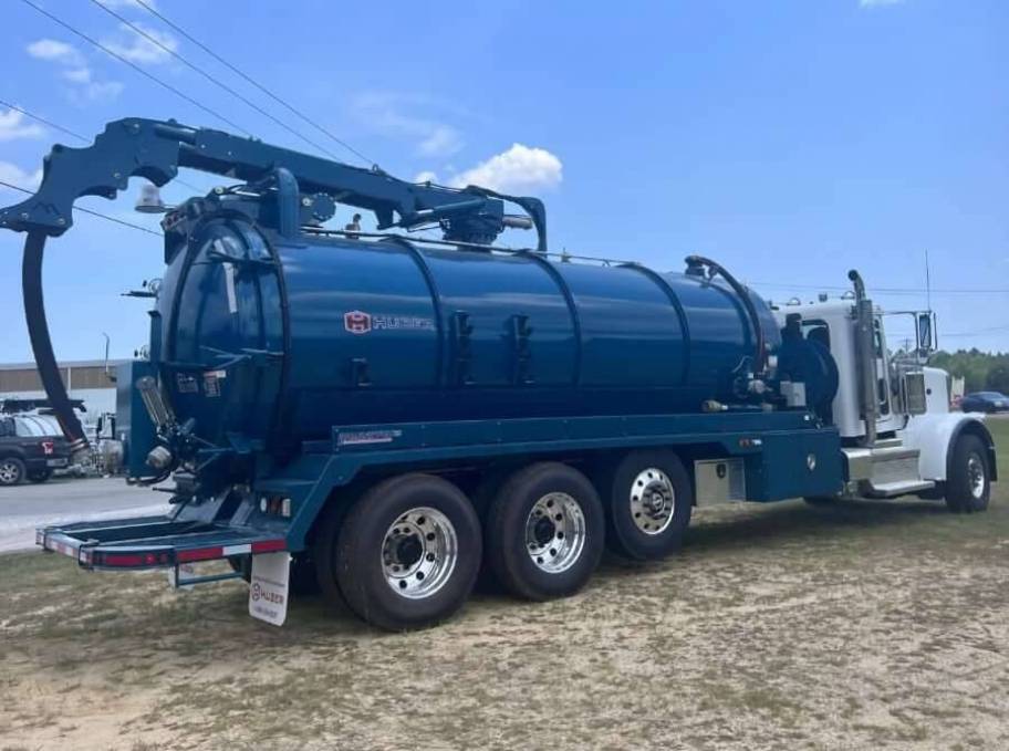 Used 2022 Huber Dominator PD Industrial Vacuum Truck on Peterbilt 389 8x4. Hydraulic tank lift and full-opening rear door, a PTO-driven hydraulic vacuum/pressure system, an auxiliary transfer pump and a top-mounted hydraulic 4-inch boom.