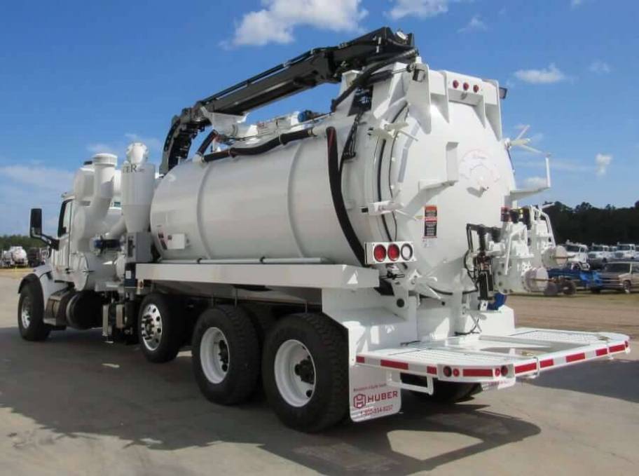 New Huber Berringer PD38 Industrial Vacuum Truck on 8x4 Peterbilt 567 with top-mounted hydraulically operated 6" boom with 4" hose. Hydraulically opening rear door with integrated safety valve. Unit controls in Nema 4 water tight enclosure. 20 gpm @ 2500 psi Water Package Upgrade w/Electric Hose Reel.