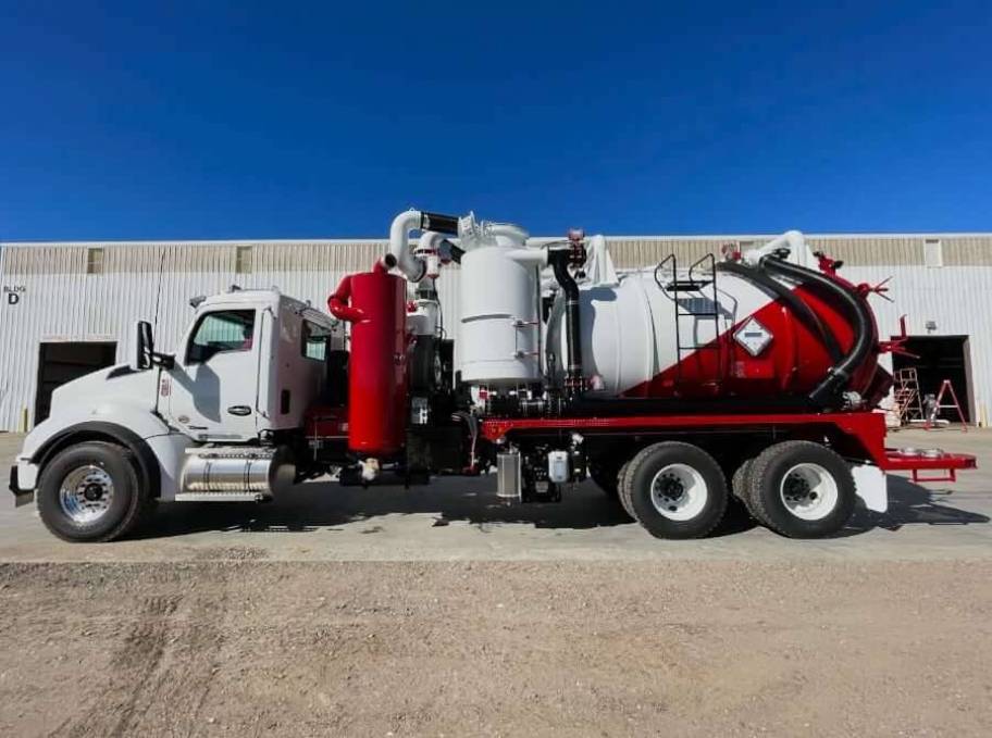 New 2026 Huber King Vac LR Industrial Liquid Ring Vacuum Truck on Kenworth T880. Integrated liquid level indicator on rear door. Hydraulically opening rear door with integrated safety valve. Ability to clean out cyclones without shutdown. 56” integrated storage cabinet on PS. Unit controls in a Nema 4 water tight enclosure.