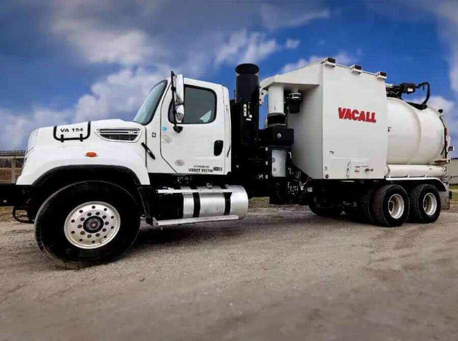 New 2026 Vacall AllVac AVRB18 Industrial Vacuum Truck on Freightliner 114-SD. Contains 60 easily removable/replaceable bags with sealed cleanout door at the bottom of baghouse, optional air cannon for reverse air flow bag cleaning